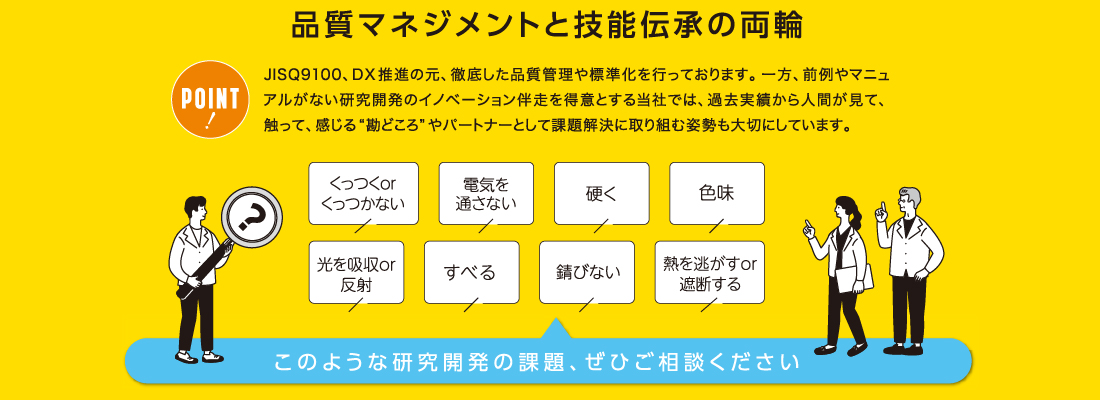 そう願う姿勢があるからこそ、自ずと物語が生まれてきます。作り手がどんなことを考えて仕事に取り組んでいるのか、「これこそが電化皮膜のこだわり!!」と思う項目を、6つに絞ってご紹介いたします。